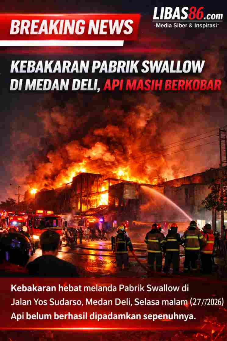 MEDAN, LIBAS86.COM – Kebakaran hebat melanda Pabrik Swallow di Jalan Yos Sudarso, Kelurahan Tanjung Mulia, Kecamatan Medan Deli, Selasa malam (27/1/2026). Api berkobar besar disertai asap hitam pekat dan sempat memicu kepanikan warga serta melumpuhkan arus lalu lintas di sekitar lokasi.