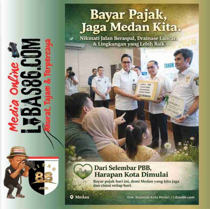 MEDAN, LIBAS86.COM – Komitmen mempercepat pembangunan dan pelayanan publik kembali ditegaskan Wali Kota Medan Rico Tri Putra Bayu Waas dengan menyerahkan Surat Pemberitahuan Pajak Terhutang (SPPT) Pajak Bumi dan Bangunan (PBB) serta Buku Daftar Himpunan Ketetapan Pajak (DHKP) Tahun 2026 lebih awal kepada jajaran kewilayahan. Penyerahan berlangsung di Kantor Wali Kota Medan, Rabu (21/1), sebagai langkah konkret agar masyarakat bisa lebih cepat menunaikan kewajiban pajaknya.
