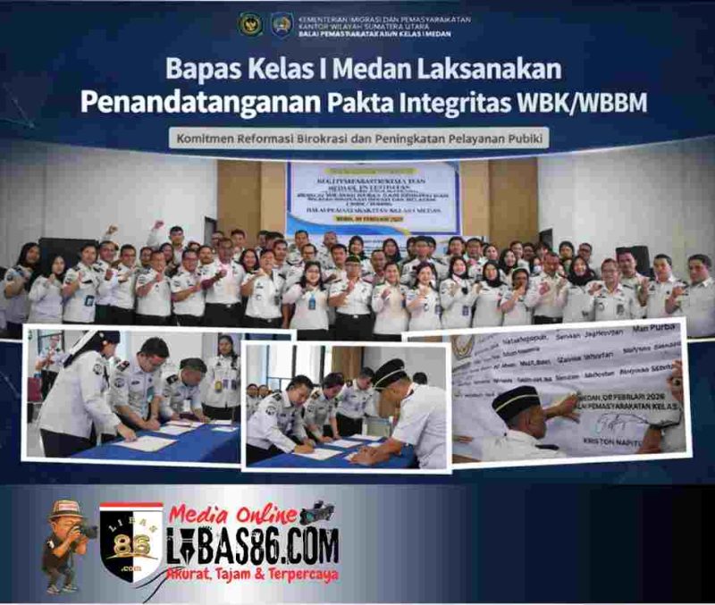 MEDAN, LIBAS86.COM – Balai Pemasyarakatan Kelas I Medan melaksanakan kegiatan Penandatanganan Komitmen Bersama dan Pakta Integritas Pembangunan Zona Integritas menuju Wilayah Bebas dari Korupsi dan Wilayah Birokrasi Bersih dan Melayani (WBK/WBBM). Kegiatan ini merupakan bagian dari upaya internal dalam mendukung pelaksanaan reformasi birokrasi serta peningkatan kualitas tata kelola pemerintahan.