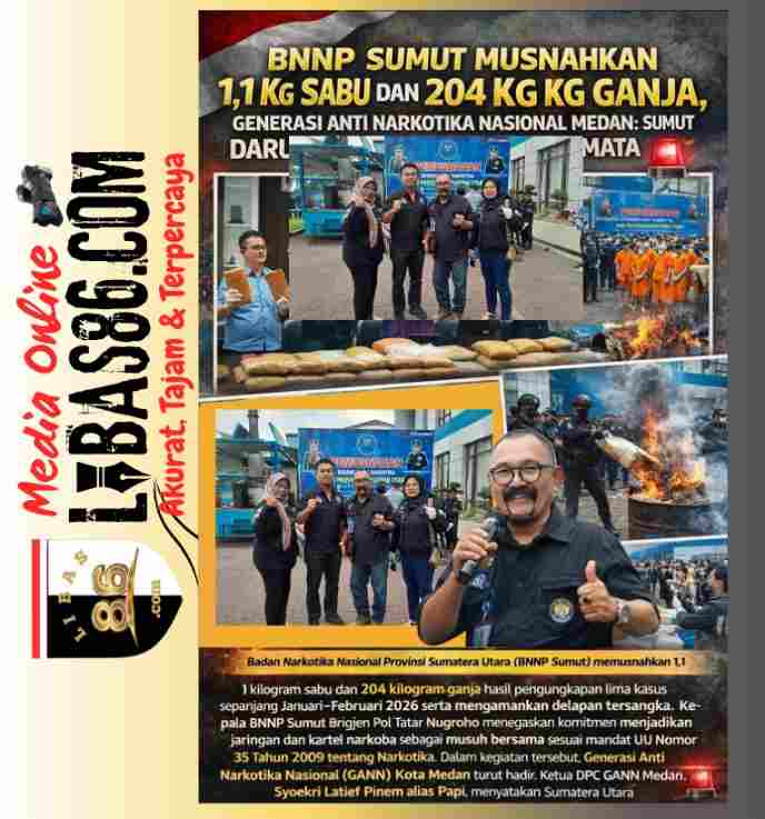 MEDAN, LIBAS86.COM – Badan Narkotika Nasional Provinsi Sumatera Utara (BNNP Sumut) memusnahkan 1,1 kilogram sabu dan 204 kilogram ganja hasil pengungkapan lima kasus sepanjang Januari–Februari 2026. Dalam pengungkapan tersebut, aparat turut mengamankan delapan tersangka yang diduga terlibat dalam jaringan peredaran gelap narkotika lintas wilayah. Pemusnahan barang bukti ini menjadi sinyal tegas bahwa Sumatera Utara masih berada dalam status darurat narkoba.