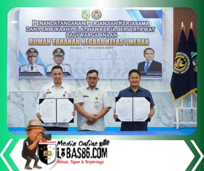 MEDAN, LIBAS86.COM – Pemko Medan melalui Dinas Ketenagakerjaan menandatangani Perjanjian Kerja Sama (PKS) dengan Rumah Tahanan Negara (Rutan) Kelas I Medan, Selasa (11/11/2025). Kerja sama ini bertujuan meningkatkan keterampilan kerja bagi warga binaan pemasyarakatan, khususnya yang berdomisili di Kota Medan.