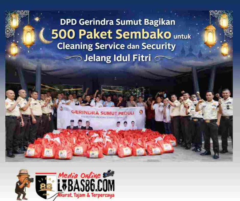 MEDAN, LIBAS86.COM  – Dewan Pimpinan Daerah (DPD) Partai Gerindra Sumatera Utara kembali menggelar aksi sosial dengan membagikan 500 paket sembako kepada para cleaning service dan tenaga security yang bertugas di sejumlah instansi pemerintahan di Kota Medan, Senin (16/3/2026). Kegiatan ini dilakukan sebagai bentuk kepedulian terhadap para pekerja yang selama ini berperan menjaga kebersihan dan keamanan lingkungan perkantoran.