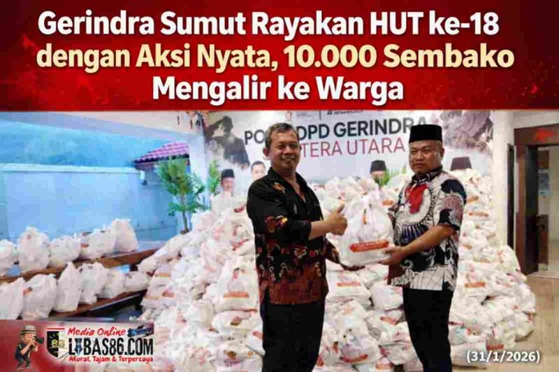 MEDAN, LIBAS86.COM – Suasana perayaan Hari Ulang Tahun (HUT) ke-18 Partai Gerindra di Sumatera Utara terasa berbeda. Tak sekadar seremonial, DPD Gerindra Sumut memilih turun langsung ke tengah masyarakat dengan membagikan 10.000 paket sembako bagi warga yang membutuhkan di berbagai daerah.
