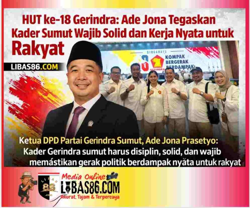 JAKARTA, LIBAS86.COM – Peringatan Hari Ulang Tahun (HUT) ke-18 Partai Gerindra menjadi momentum konsolidasi serius bagi Dewan Pimpinan Daerah (DPD) Partai Gerindra Sumatera Utara. Ketua DPD Gerindra Sumut, Ade Jona Prasetyo, menegaskan bahwa soliditas kader bukan sekadar slogan, melainkan syarat mutlak agar politik benar-benar bekerja untuk rakyat.