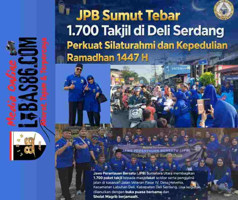 DELI SERDANG — Organisasi kemasyarakatan Jawa Perantauan Bersatu (JPB) Sumatera Utara menggelar aksi sosial pembagian 1.700 paket takjil dalam rangka menyemarakkan Ramadhan 1447 Hijriah. Kegiatan yang berlangsung di Jalan Veteran Pasar IV, Desa Helvetia, Kecamatan Labuhan Deli, Kabupaten Deli Serdang, Sumatera Utara ini dirangkai dengan buka puasa bersama sebagai upaya mempererat silaturahmi dan memperkuat nilai kepedulian sosial di tengah masyarakat.