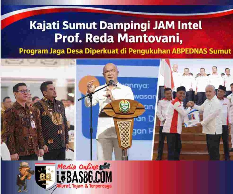 MEDAN, LIBAS86.COM – Komitmen penguatan tata kelola dana desa kembali ditegaskan dalam kegiatan strategis nasional Program Jaksa Garda Desa (Jaga Desa) yang dirangkai dengan pengukuhan Pengurus DPD dan DPC Asosiasi Badan Permusyawaratan Desa Nasional (ABPEDNAS) se-Sumatera Utara. Kegiatan berlangsung di Aula Raja Inal Siregar, Kantor Gubernur Sumatera Utara, Sabtu (14/2/2026), dan dihadiri langsung Jaksa Agung Muda Intelijen Kejaksaan Agung RI, Prof. Dr. Reda Mantovani, didampingi Kepala Kejaksaan Tinggi Sumatera Utara, Dr. Harli Siregar, SH., M.Hum.