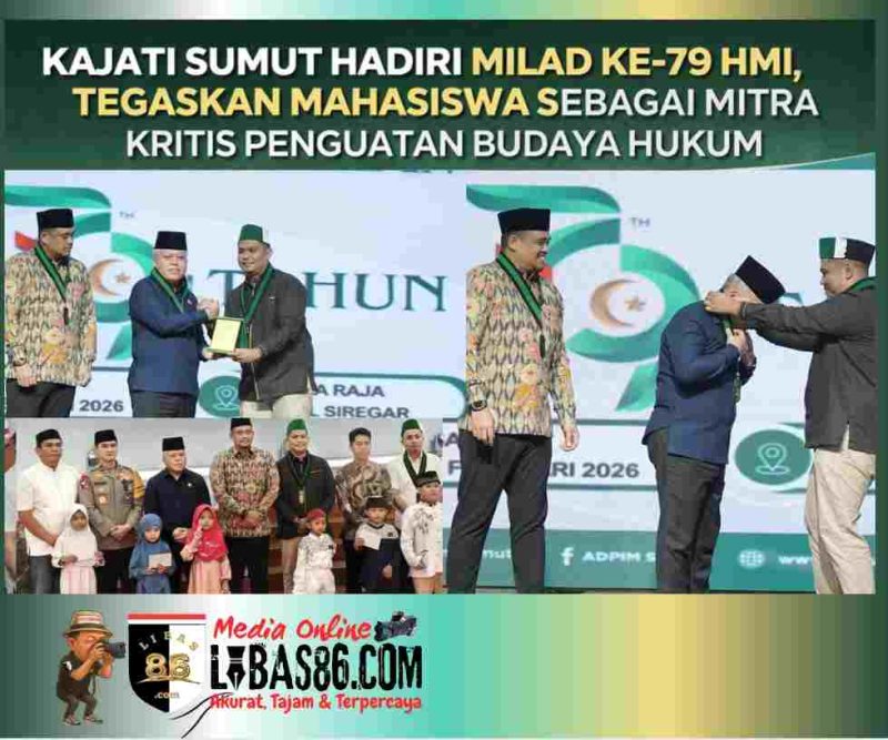 MEDAN, LIBAS86.COM – Kepala Kejaksaan Tinggi Sumatera Utara Harli Siregar menghadiri acara puncak Milad ke-79 Himpunan Mahasiswa Islam (HMI) Badko Sumatera Utara yang digelar di Aula Raja Inal Siregar, Kantor Gubernur Sumatera Utara, Sabtu (7/2/2026). Kehadiran Kajati Sumut bersama Bobby Nasution menandai komitmen negara dalam merawat ruang dialog antara aparatur penegak hukum dan gerakan mahasiswa.
