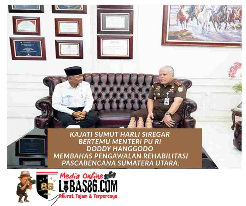 SUMATERA UTARA, LIBAS86.COM – Kepala Kejaksaan Tinggi Sumatera Utara (Kajati Sumut) Harli Siregar, SH, MHum, menegaskan komitmen Kejaksaan dalam mengawal dan memberikan pendampingan hukum terhadap program rehabilitasi daerah terdampak bencana di Sumatera Utara. Hal tersebut disampaikan saat menerima kunjungan Menteri Pekerjaan Umum Republik Indonesia, Doddy Hanggodo, di Kantor Kejati Sumut, Jalan Jenderal A.H. Nasution, Medan, Senin (9/3/2026).