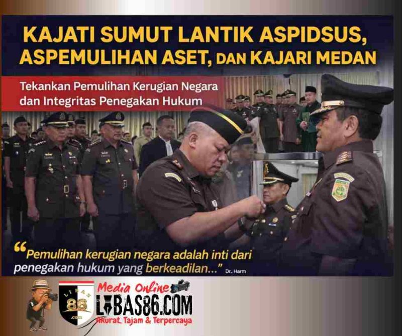 MEDAN, LIBAS86.COM – Kepala Kejaksaan Tinggi Sumatera Utara, Harli Siregar, melantik dan memimpin serah terima jabatan Asisten Tindak Pidana Khusus (Aspidsus), Asisten Pemulihan Aset (Aspema), serta Kepala Kejaksaan Negeri Medan, Rabu (4/2/2026), di Aula Cipta Kerta Lantai III Kejati Sumut. Pelantikan tersebut merupakan bagian dari kebijakan strategis pimpinan Kejaksaan RI dalam rangka penguatan kinerja, tata kelola, dan integritas institusi penegak hukum.