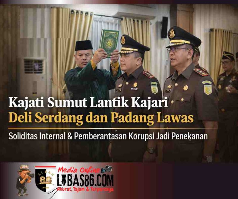 MEDAN, LIBAS86.COM – Kepala Kejaksaan Tinggi Sumatera Utara (Kajati Sumut) Dr. Harli Siregar, SH., M.Hum secara resmi melantik dan mengambil sumpah jabatan Kepala Kejaksaan Negeri (Kajari) Deli Serdang dan Kajari Padang Lawas. Prosesi pelantikan berlangsung di Aula Cipta Kerta Lantai III Kantor Kejaksaan Tinggi Sumatera Utara, Jalan Jenderal Besar AH Nasution, Medan, Rabu (18/2/2026).