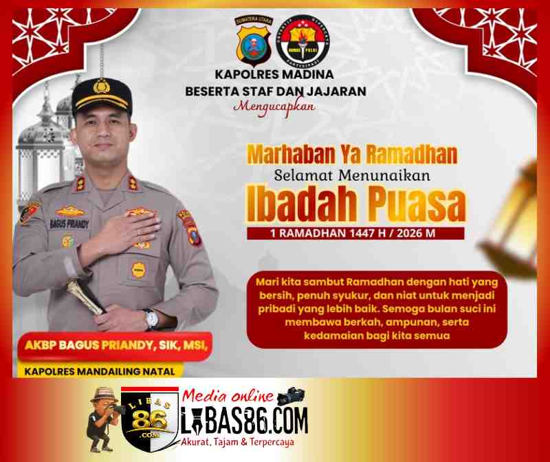 MANDAILING NATAL, LIBAS86.COM – Menyambut datangnya bulan suci Ramadhan 1447 Hijriah, Kapolres Mandailing Natal AKBP Bagus Pryandi, S.I.K,. M.Si, mengajak seluruh masyarakat Mandailing Natal untuk mempersiapkan diri secara lahir dan batin, serta menjadikan Ramadhan sebagai momentum memperbaiki diri dan memperkuat keimanan. Selasa (17/2/2026).