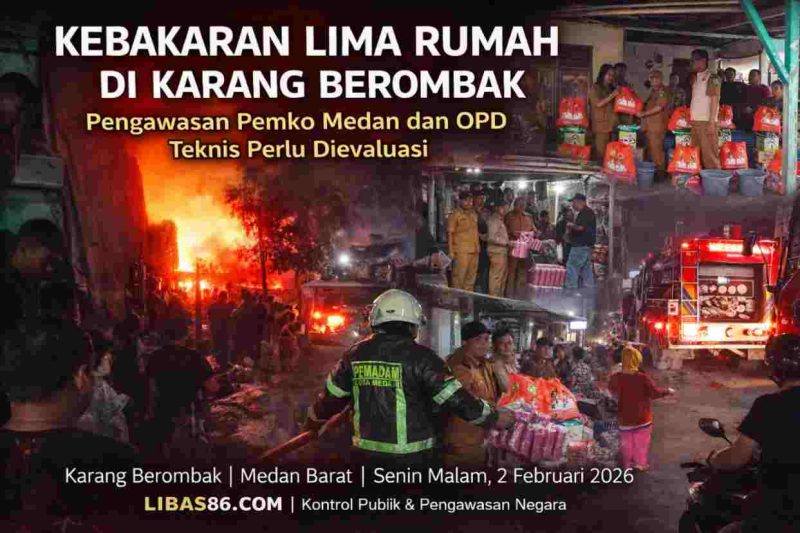 MEDAN, LIBAS86.COM – Kebakaran terjadi di kawasan permukiman padat Jalan Karya Gang Bidan, Lingkungan XIII, Kelurahan Karang Berombak, Kecamatan Medan Barat, pada Senin malam (2/2/2026) sekitar pukul 21.30 WIB. Peristiwa tersebut mengakibatkan lima unit rumah terdampak, dengan total empat kepala keluarga dan 15 jiwa. Tidak terdapat korban jiwa, sementara kerugian materi diperkirakan mencapai ratusan juta rupiah.