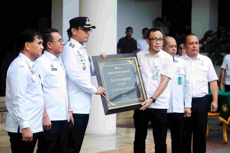 Piagam Penghargaan ini diterima Wali Kota Rico Waas dari Kepala Kantor Wilayah BPJS Ketenagakerjaan Sumbagut, I Nyoman Suarjaya pada Apel penyerahan penghargaan program empowering kepling di halaman tengah Kantor Wali Kota Medan, Rabu (29/10/25).