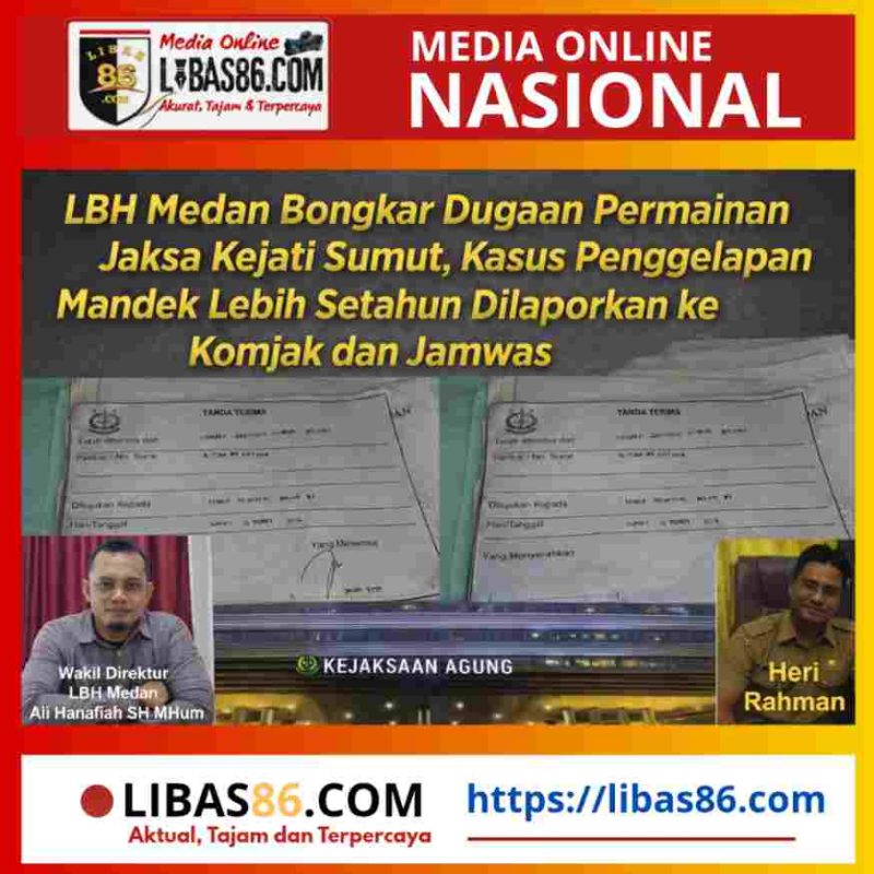 MEDAN, LIBAS86.COM — LBH Medan melaporkan oknum jaksa peneliti dan pejabat Seksi Tindak Pidana Orang dan Harta Benda (Oharda) Kejaksaan Tinggi Sumatera Utara ke Komisi Kejaksaan RI dan Kejaksaan Agung RI. Pengaduan itu terkait dugaan lambannya penanganan perkara penggelapan yang menjerat Heri Rahman sebagai tersangka, namun hingga kini berkas perkara belum juga dinyatakan lengkap atau P21.