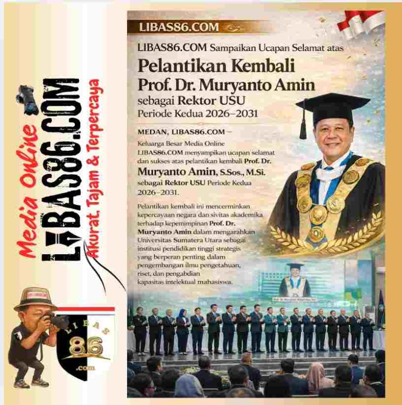 MEDAN, LIBAS86.COM  – Keluarga Besar Media Online LIBAS86.COM menyampaikan ucapan selamat dan sukses atas pelantikan kembali Prof. Dr. Muryanto Amin, S.Sos., M.Si. sebagai Rektor Universitas Sumatera Utara (USU) untuk masa jabatan periode kedua 2026–2031, yang secara resmi dilantik pada 28 Januari 2026.