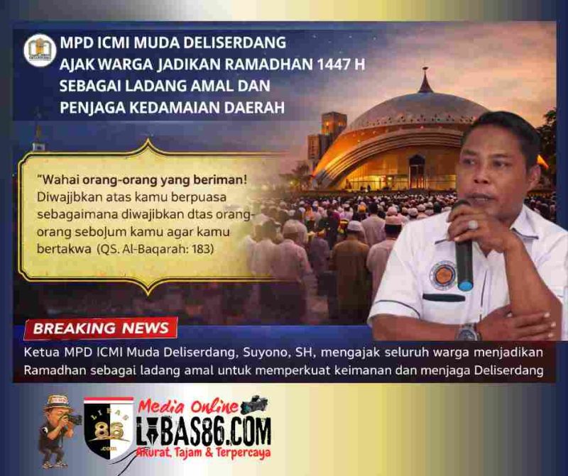 DELI SERDANG, LIBAS86.COM – Suasana bulan suci Ramadhan 1447 Hijriah menjadi momentum refleksi dan penguatan nilai spiritual bagi umat Islam di Kabupaten Deliserdang. Ketua MPD ICMI Muda Deliserdang, ICMI Muda, Suyono, S.H., mengajak seluruh masyarakat untuk menjadikan Ramadhan sebagai ladang amal sekaligus benteng moral dalam menjaga ketertiban dan kedamaian daerah.
