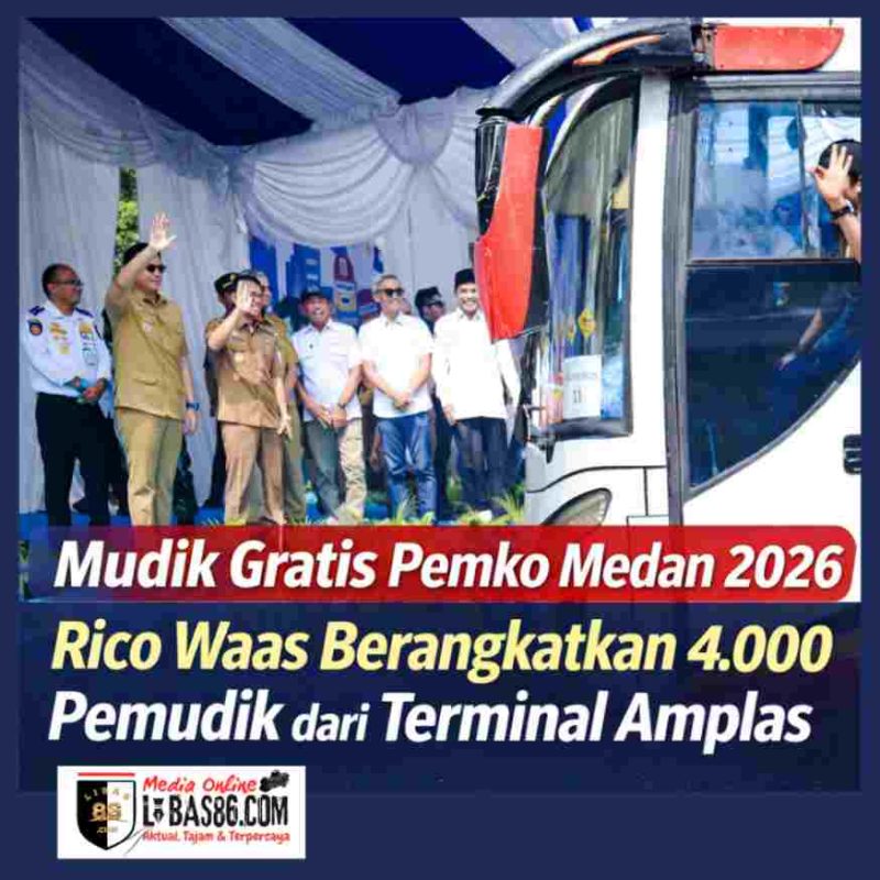 MEDAN, LIBAS86.COM  – Pemerintah Kota (Pemko) Medan kembali menggelar program Mudik Bareng Pemko Medan 2026 dengan memberangkatkan sekitar 4.000 pemudik secara gratis menuju berbagai daerah di Sumatera Utara. Pelepasan ribuan pemudik tersebut dilakukan langsung Wali Kota Medan Rico Tri Putra Bayu Waas didampingi Wakil Wali Kota Medan H. Zakiyuddin Harahap di Terminal Amplas, Senin (16/3/2026).
