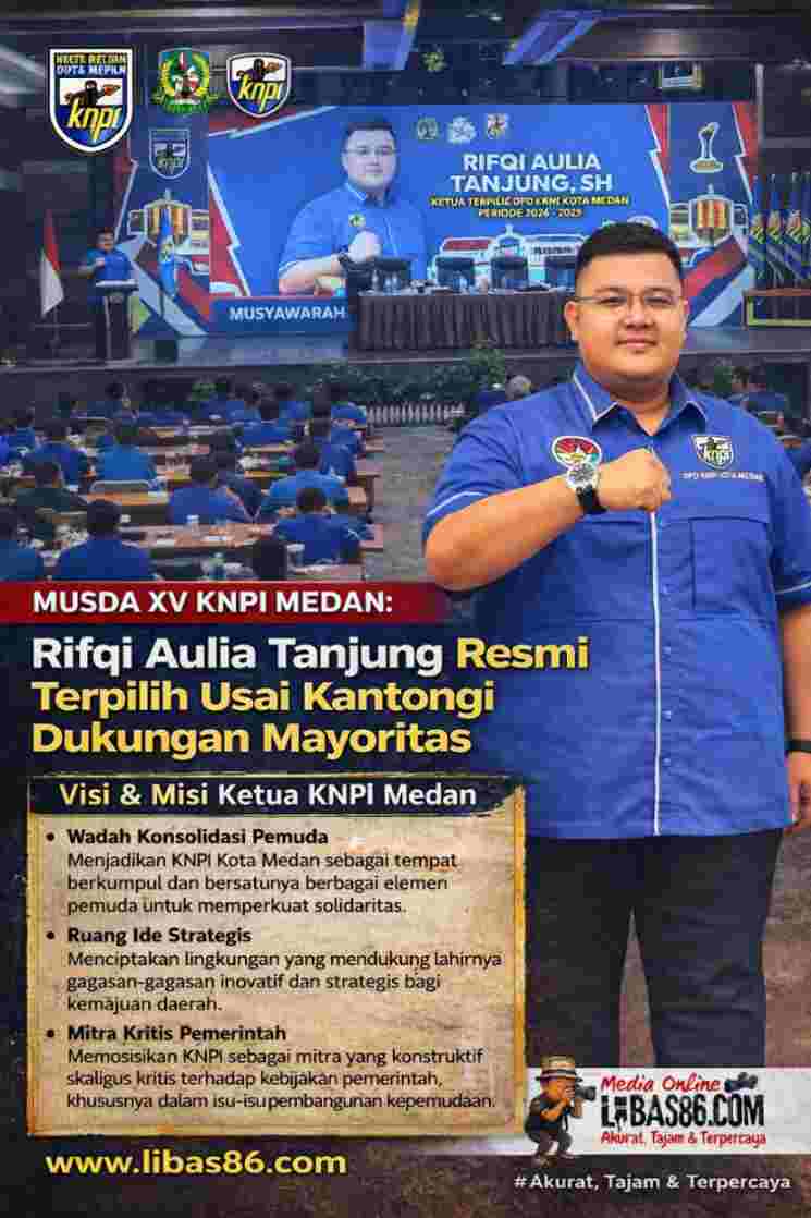 MEDAN, LIBAS86.COM – Musyawarah Daerah (Musda) XV Dewan Pimpinan Daerah (DPD) Komite Nasional Pemuda Indonesia (KNPI) Kota Medan resmi menetapkan Rifqi Aulia Tanjung, S.H. sebagai Ketua DPD KNPI Kota Medan periode 2026–2029, setelah meraih dukungan suara mayoritas dalam forum tertinggi organisasi tersebut, Jum’at (9/1/2026)