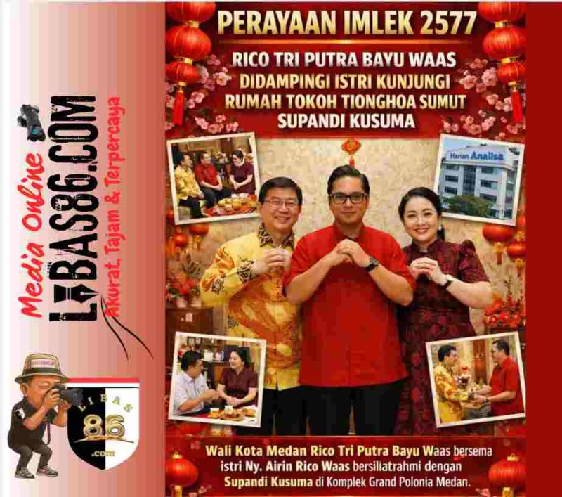 MEDAN, LIBAS86.COM – Momentum perayaan Tahun Baru Imlek 2577 Kongzili dimaknai dengan silaturahmi penuh kehangatan oleh Wali Kota Medan, Rico Tri Putra Bayu Waas. Didampingi istri, Ny. Airin Rico Waas selaku Ketua TP PKK Kota Medan, ia mengunjungi kediaman tokoh Tionghoa Sumatera Utara sekaligus Pemilik Harian Analisa, Supandi Kusuma, di Komplek Grand Polonia Medan, Selasa (17/2/2026).