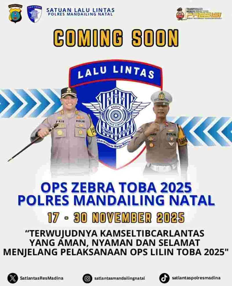 PENYABUNGAN, LIBAS86.COM – Polres Mandailing Natal (Madina) di bawah kepemimpinan Kapolres AKBP Arie Sofandi Paloh, S.H., S.I.K. akan melaksanakan Operasi Zebra Toba 2025 mulai tanggal 17 hingga 30 November 2025.