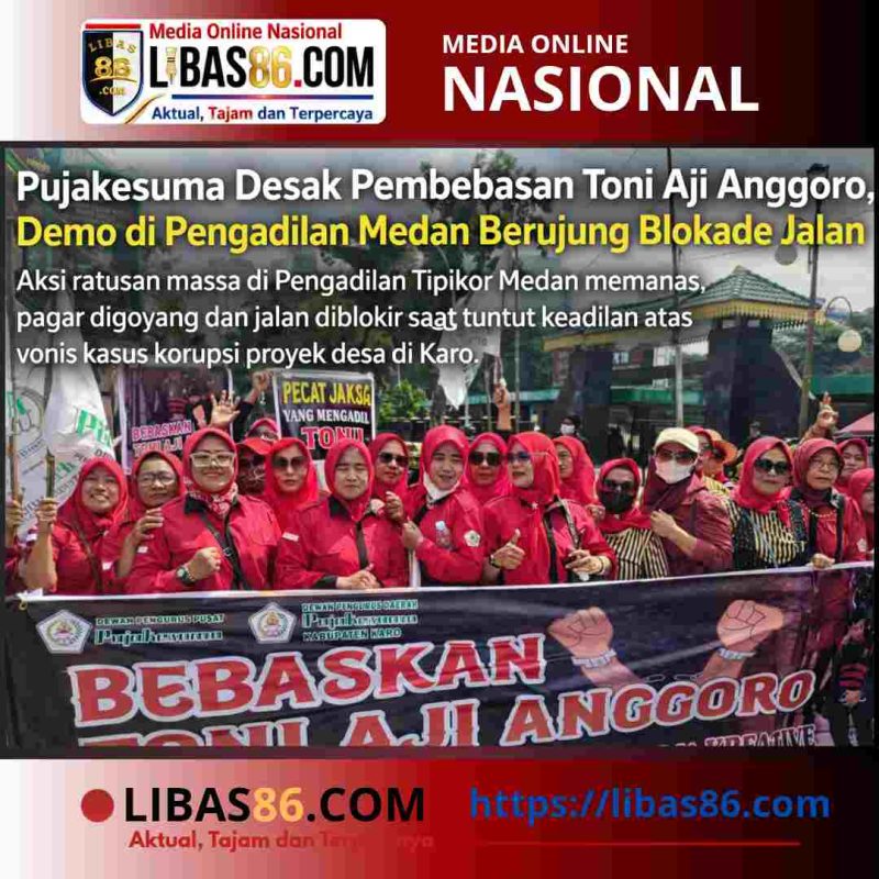 MEDAN, LIBAS86.COM — Ratusan massa dari Paguyuban Putra Jawa Kelahiran Sumatera (Pujakesuma) menggelar aksi unjuk rasa di Pengadilan Tipikor Medan dan Kejaksaan Tinggi Sumatera Utara, Senin (20/4/2026). Aksi ini menuntut pembebasan Toni Aji Anggoro, terpidana kasus korupsi proyek video profil dan website desa di Kabupaten Karo yang telah divonis satu tahun penjara serta denda subsider dua bulan.