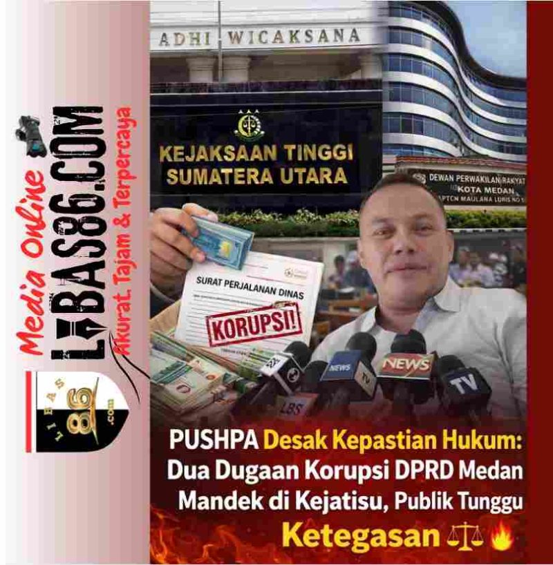 MEDAN, LIBAS86.COM — Sorotan terhadap penanganan perkara dugaan korupsi kembali mengarah ke Sumatera Utara. Pusat Studi Pembaharuan Hukum dan Peradilan (PUSHPA) mempertanyakan progres dua perkara yang ditangani penyidik Pidana Khusus Kejaksaan Tinggi Sumatera Utara (Kejatisu), yakni dugaan korupsi Surat Perintah Perjalanan Dinas (SPPD) di Sekretariat DPRD Kota Medan Tahun Anggaran 2024 senilai Rp4,4 miliar serta dugaan penyalahgunaan jabatan oleh empat anggota Komisi III DPRD Medan pada 2025. Hingga kini, kedua perkara disebut masih berada pada tahap penyelidikan.
