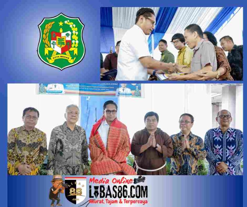 MEDAN, LIBAS86.COM – Safari Natal Pemko Medan di Gereja Katolik Paroki Santo Antonius Dari Padua, Minggu (7/12/2025), berlangsung hangat. Kedatangan Wali Kota Medan Rico Tri Putra Bayu Waas disambut suka cita oleh pengurus gereja yang mengalungkan rangkaian bunga serta menyelempangkan ulos sebagai simbol kasih dan doa kesehatan.
