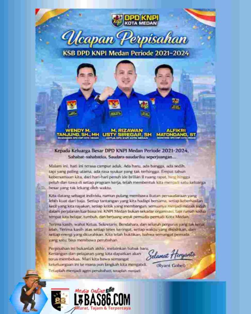 MEDAN, LIBAS86.COM – Tak terasa, waktu telah membawa DPD KNPI Kota Medan Periode 2021–2024 sampai di persimpangan perjalanan. Empat tahun yang diisi dengan rapat panjang, perdebatan hangat, tawa lepas, kelelahan, dan harapan—kini menjelma menjadi kenangan yang tak mudah dilupakan.
