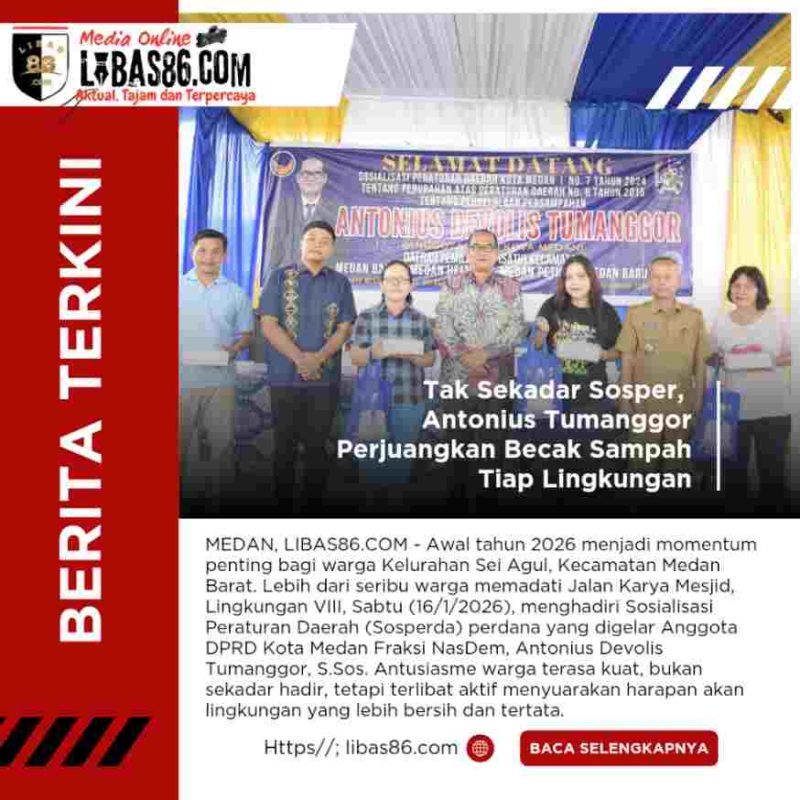 MEDAN, LIBAS86.COM – Awal tahun 2026 menjadi momentum penting bagi warga Kelurahan Sei Agul, Kecamatan Medan Barat. Lebih dari seribu warga memadati Jalan Karya Mesjid, Lingkungan VIII, Sabtu (16/1/2026), menghadiri Sosialisasi Peraturan Daerah (Sosperda) perdana yang digelar Anggota DPRD Kota Medan Fraksi NasDem, Antonius Devolis Tumanggor, S.Sos. Antusiasme warga terasa kuat, bukan sekadar hadir, tetapi terlibat aktif menyuarakan harapan akan lingkungan yang lebih bersih dan tertata.